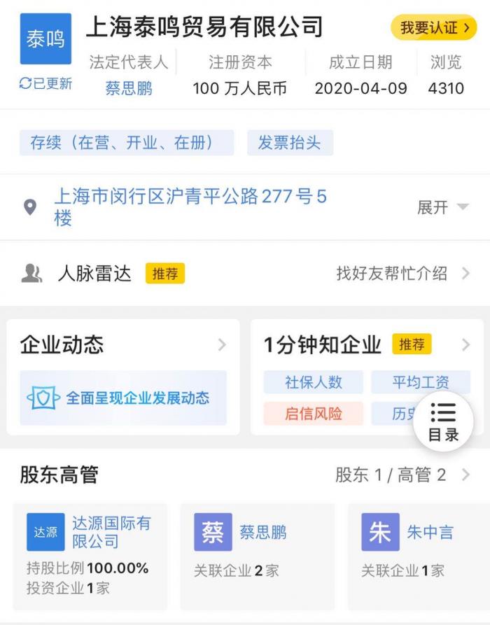 启信宝显示,上海泰鸣成立于2020年4月9日,注册资本金100万元人民币,法人代表为蔡思鹏。公司成立不到一个月,注册资本金不多,法人代表在房地产业内也名不见经传。对上海泰鸣100%控股的达源国际有限公司(简称“达源国际”)是一家成立于香港的私人股份有限公司。