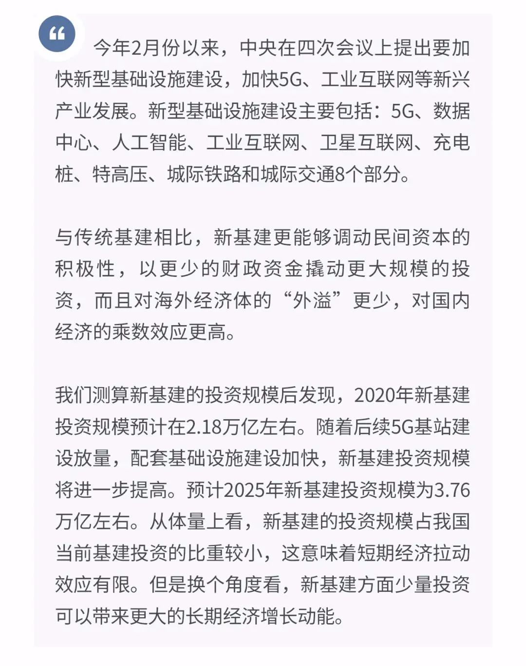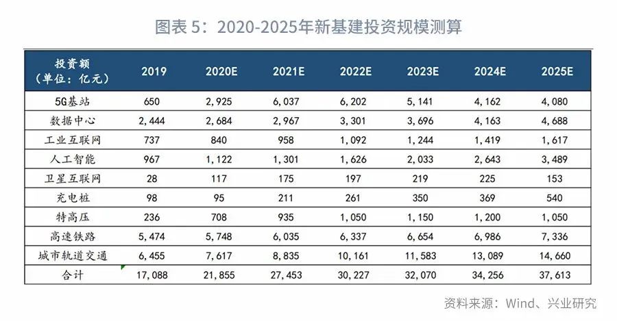 新基建短期可以拉动相关设备生产(而计算机通讯设备是目前我国工业第一大产业),间接为经济活动线下转线上、劳动者自主创业提供更好的条件,长期则为我国经济提高效率铺就信息高速公路,社会意义、经济意义巨大。那么新基建投资规模到底需要多少呢? 通过对新基建8个重要类目的分项测算,2020年新基建的投资规模预计在2.18万亿左右。后续随着5G基站建设放量,配套基础设施跟进建设加快,新基建年投资规模将快速增长,预计到2025年当年的投资规模或达到3.76万亿。