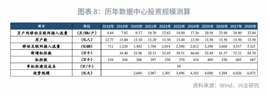 通过估算移动互联网接入流量的增长规模,即可测算数据中心未来的投资规模。 根据中国移动2018年发布的《中国5G产业发展和投资报告》,其预计到2028年5G用户的月平均流量将增长7倍左右。工信部数据显示,2018年、2019年月户均移动互联网接入流量分别为4.64GB/月/户和7.82GB/月/户,接入的用户数分别为12.8亿人和13亿人 [5] 。我们假设接下来5年每年增长1000万人,之后一直保持13.5亿用户数。月户均移动互联网接入流量方面,按照17%的年复合增长率计算。 单个机柜建设价格方面,从数据港、宝信软件、光环新网的公司公告、官网数据来看,单个机柜的建设价格在20万元左右。但这几个数据中心集中在北京、上海,地价贵建设成本高,综合考虑,我们假设全国平均单个机柜建设价格在10万元左右。结合流量测算,可得数据中心历年的投资规模如下。