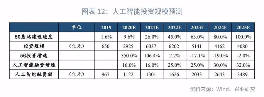 而这两个限制因素在未来2-3年可能仍将存在,人工智能投资在政策呵护下或温和增长。增长率方面,我们选取2015-2019年高技术产业的年复合增长率16%。后续,随着5G组网完成、工业互联网规模提升,AI技术或取得突破,带动人工智能企业融资重新快速增长,将适当调高投资增速。因此,我们对于人工智能投资规模预测如下: