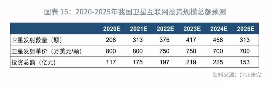 从当前的卫星发射的成本来看,Telesat预计300颗卫星的星座总造价为30亿美元,单颗卫星从制作到发射的成本为1000万美元左右;Oneweb披露单个卫星造价即接近100万美元左右 [8]。而美国卫星工业协会数据显示,2018年卫星制造、卫星发射和地面设备的产值分别为:195、62、1252亿美元。按相同比例换算后,Oneweb单颗卫星发射总成本约为774万美元。我国当前卫星制造和发射技术与其他国家整体较为接近。假设2020年我国卫星单颗发射成本在800万美元左右,并随着技术进步逐渐下降,上述2083颗卫星的发射计划在2025年前发射完毕。可测算得我国人造卫星产业投资规模为:
