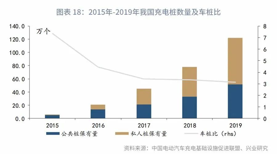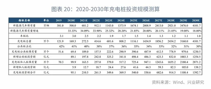 公共充电桩与私人充电桩的比例则大体保持在4:6水平,并随着新能源汽车消费的广化,逐渐转变为3:7。公共充电桩的造价在5万元/个,私人充电桩的造价则大概在2千元/个。测算得各年充电桩投资规模如下: