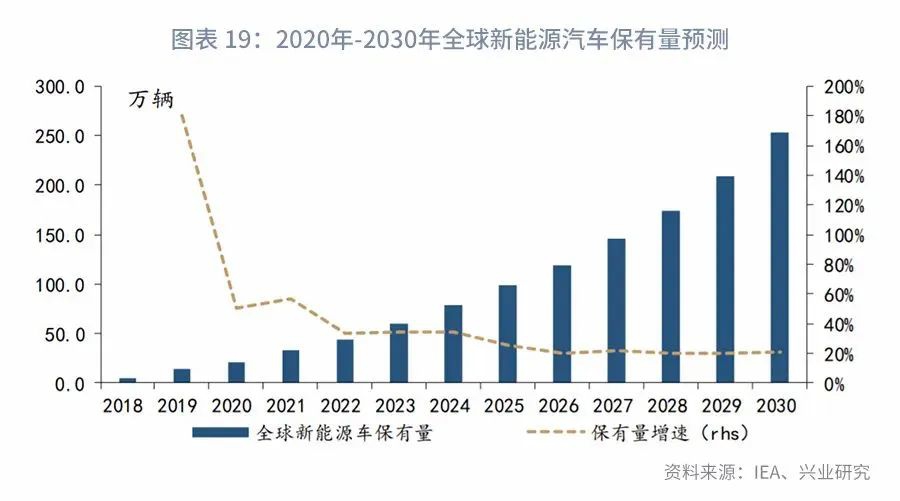 充电桩投资规模预测通过新能源汽车保有量、车桩比来计算新增规模。IEA对全球新能源汽车保有量的预估值如下。由于我国新能源汽车发展速度较快,当前保有量年增速为46.0%,与全球2021年水平接近,后续增速或保持在35%-20%左右。车桩比方面,2019年末,我国车桩比约为3.1:1,与我国《电动汽车充电基础设施发展指南(2015-2020)》规划的到2020年实现车桩比1:1的差距尚存。当前充电桩建设有提速趋势,但是土地资源、利用效率等问题依然严峻,因此我们假设至2025年我国车桩比达到1.5:1,至2030年车桩比逐渐达到1:1。