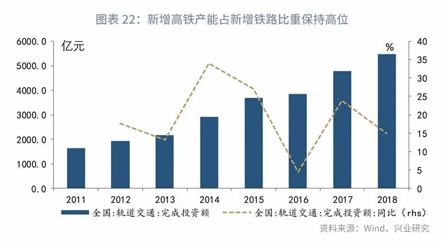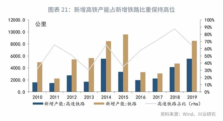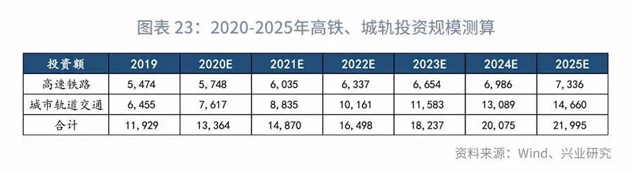 综上,测算得高铁和城轨投资规模如下。预计2020年两者的合计投资规模即超过1.3万亿,到了2025年有望达到2.2万亿,是未来基建投资的重要组成部分。