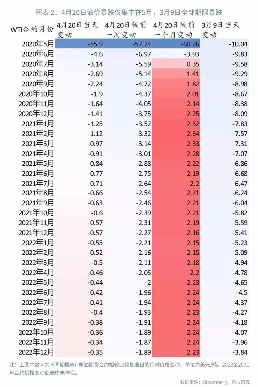 同时从原油期限结构来看,4月20日的暴跌与3月9日也存在显著差异。4月20日WTI5月期油价的暴跌只是因为交割问题导致的单一合约的情况,6月之后的合约表现相对平稳。而且相较1个月前的原油结算价(3月20日),2020年7月之后的油价还出现了不同程度的上升,最远期的2031年2月合约相较1个月前还上涨12.7美元/桶。而反观3月9日当天,原油全部上市合约均出现不同程度暴跌,整体曲线下沉(详见图表1和图表2)。