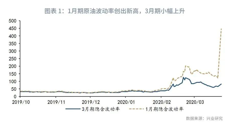 2020年3月9日,油价暴跌带动原油所有期限波动率创历史新高,进而带动全球所有资产价格暴跌。2020年4月20日,WTI5月交割的油价虽然单日暴跌56美元/桶,当日结算价-37.63美元/桶。1月期原油波动率指数达到444,再创新高;但3月期原油隐含波动率仅小幅上升,并未创出新高。