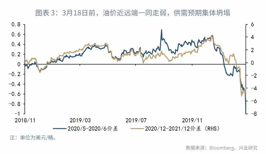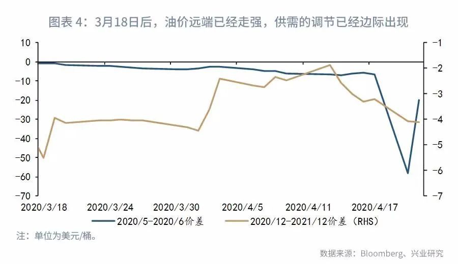 目前原油市场的胀库情况远超2016和2017年时,全球原油库存确实存在即将达到上限的情况。在此情况下,原油产量被倒逼,将不得不巨幅快速的下降。所以原油的期限结构仍将呈现结构性的差异,就是近端的急剧承压,以及未来原油产量骤降的预期支撑远端油价。其实在3月18日原油下跌后,远端的结构就已经触底走强,而近月因为库存的极度承压以及近期逼空大戏的上演,急剧的走弱(详见图表3)。
