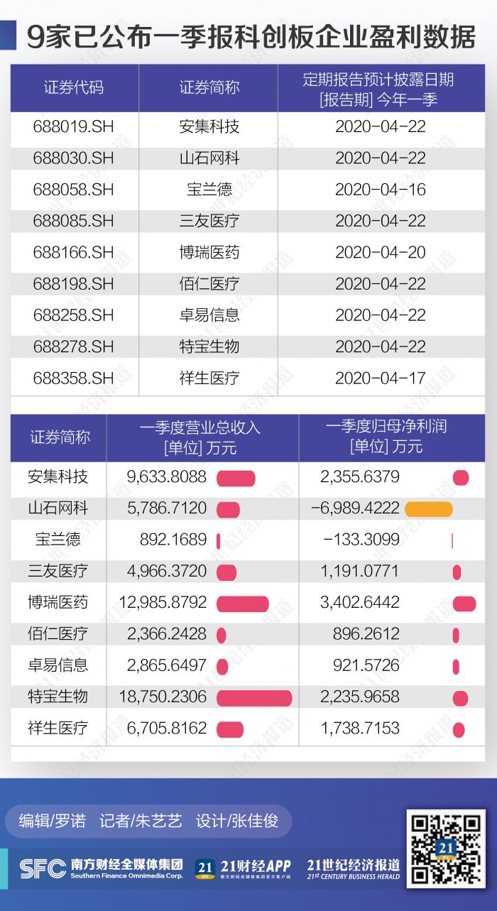 Wind数据显示,截至4月22日,98家已上市发行科创板公司中,有9家公司抢先发布了2020年一季报,除宝兰德、祥生医疗之外,还有博瑞医药(688166.SH)、三友医疗(688085.SH)、佰仁医疗(688198.SH)、特宝生物(688278.SH)、安集科技(688019.SH)、山石网科(688030.SH)、卓易信息(688258.SH)。