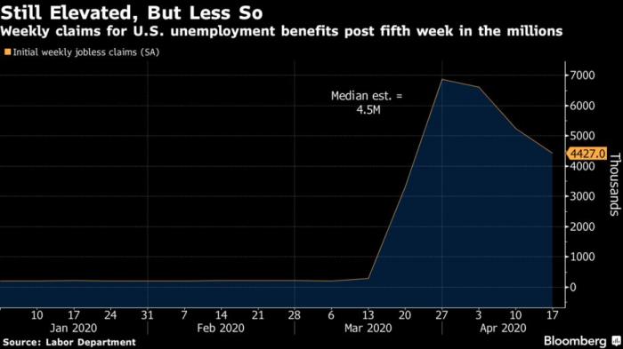 当地时间4月23日周四,美国劳工部公布的最新数据显示,截至4月18日当周美国初请失业金人数录得442.7万,略高于接受道琼斯调查的经济学家预期430万。