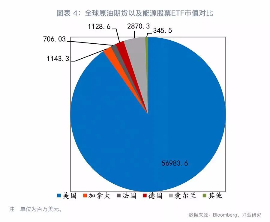 股票类ETF市值较期货类ETF大,追踪标的主要是各类股票指数。目前全球规模最大的原油相关类ETF是State Street Global Advisors发行的Energy Select Sector SPDRFund——XLE基金,投资标的是美国的大型油企、页岩油企业和油服公司。截止2018年2月21日,其资产价值达171.8亿美元,是唯一一支超过百亿美元规模的原油类ETF。资产规模最大的原油商品期货类ETF是US Commodity Funds发行的United States Oil FundLP——USO,资产规模达19.67亿美元(详见图表 3)。整体来看,美国上市的原油类ETF市值规模最大(详见图表 4)。