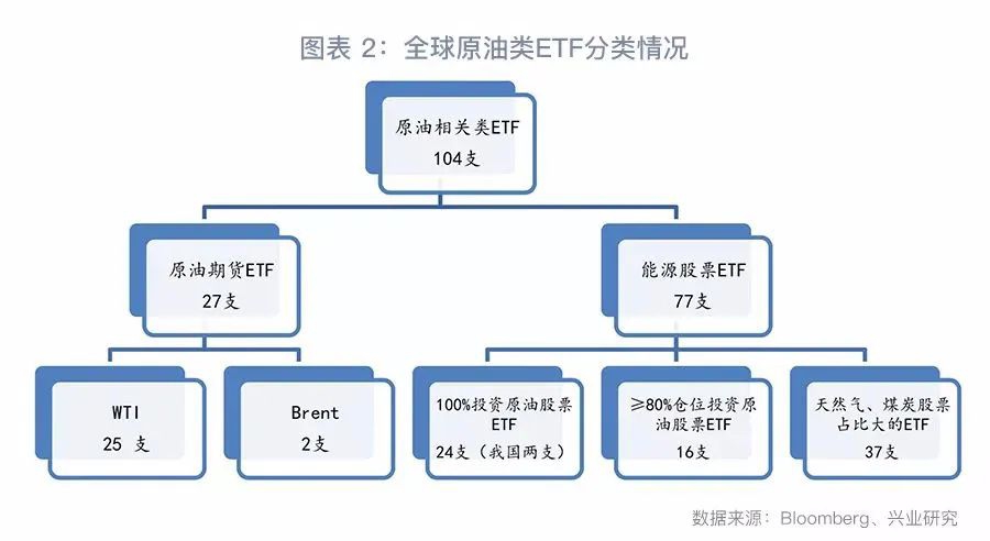 按投资标的划分,目前彭博上投资标的为WTI/Brent原油期货[2]的ETF以及全球能源股票类ETF共104支[3]。其中以原油类期货为投资标的的ETF共有27只。能源类股票(原油、天然气和煤炭等)为投资标的有77支。这77支中包含100%投资原油股票的ETF24支,原油类股票持仓比例超过80%的ETF16支,以及37只投资标的比较多样化的ETF——其原油股票占比较小(详见图表 2)。