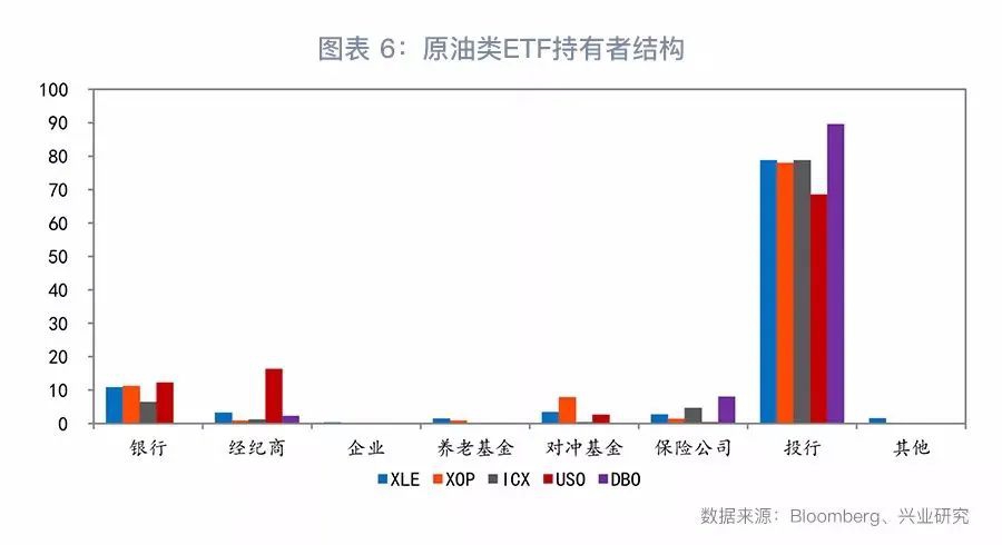 从主要原油类ETF[4]持有者结构来看,几乎全是专业机构,其中投资银行是原油类ETF最大的客户。由于没有进一步细分的持仓用途,较难分辨其投资标的具体去向,可能主要是服务于投行的自营业务和代客业务。传统商业银行也会将原油类ETF作为其资产配置中的一环。对于追求绝对收益的对冲基金,原油类ETF的吸引力较小(详见图表 6)。