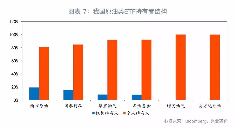 与国外原油ETF投资者结构存在较大差别,我国几支原油ETF持有者基本为个人投资者(详见图表 7)。随着国内原油期货的上市,未来我国原油ETF投资者结构也有望向机构化转变。