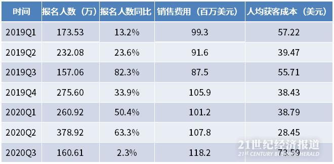 因为周期性原因,公司三季度一般来说是报名的淡季,但从上面的表格可以看到,2019年3季度公司也曾经录得82.3%的同比增速。2020财年3季度,报名人数只有160.61万人,同比仅增长了2.3%。这也是2019年以来最低的同比增速。