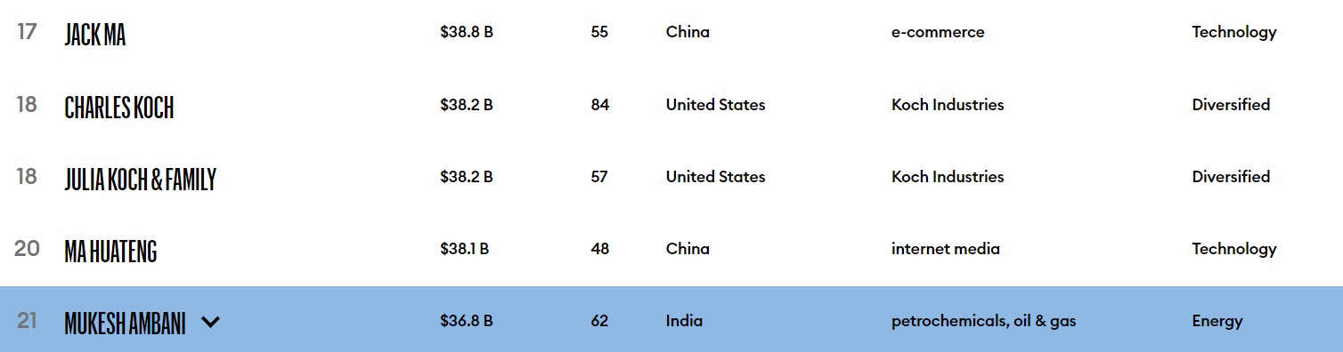 但据福布斯全球富豪实时榜单显示,目前马云、马化腾、安巴尼分别为17位、20位、21位。