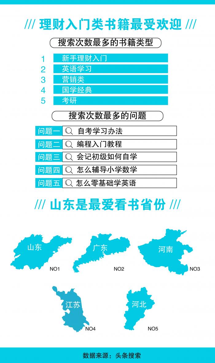在互联网平台上,什么类型的书籍最受欢迎?据头条搜索榜单,“新手理财入门”、“英语学习”和“营销类”是头条搜索次数最多的书籍类型。