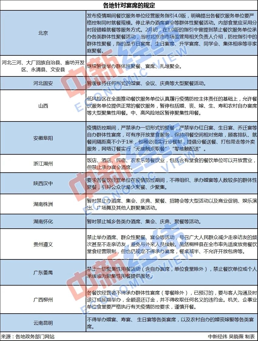 目前仍有北京、山西、河北三河、大厂回族自治县、廊坊开发区、永清县、文安县、固安县、安徽阜阳、浙江湖州、陕西汉中、湖南株洲、怀化、贵州遵义、广东番禺、广西柳州、云南昆明等地严禁举办婚宴等宴席。