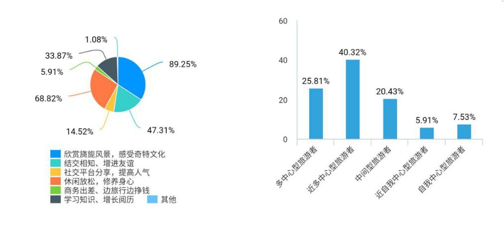 笔者依据麦金托什的旅游需求理论并结合现代旅游实际来探讨旅游者出游的目的,对应的题项得出的结果是:以欣赏旖旎风光、感受奇特文化为主要目的在旅游者中最为显著,占总数得89.25%;其次是休闲放松、修养身心,占68.82%;再次是结交相知、增进友谊,占47.31%;以学习为主要目的占比33.87%;基本符合求异、求新、逃避、学习的旅游需求特征。依据Plog的旅游动机理论,笔者设置题项将答者的特征作区分,得出多中心型旅游者占25.81%,近多种新型旅游者占40.32%,中间型旅游者占20.43%,这与年轻人群体敢于打破桎梏、向往新的旅兴游方式有关。此结果体现了年轻群体普遍喜欢探索、追求新鲜感和自由感,这类群体喜欢自由行,被刺激、有趣的旅游方式吸引,具有冒险精神。