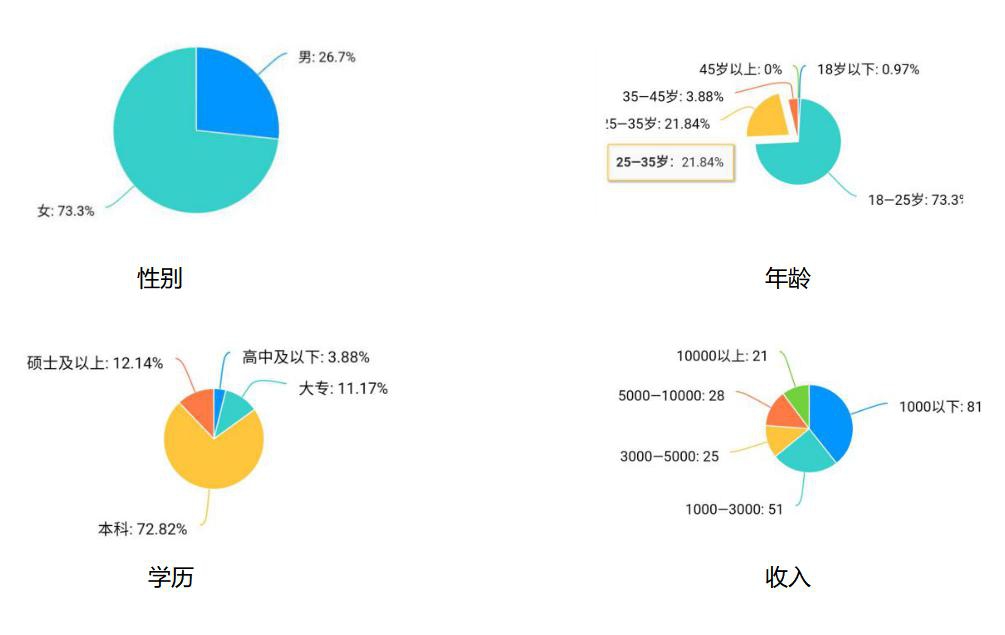 问卷的答者中女性有151人,占73.3%,男性有55人,占26.7%,在年龄分布中,18岁以下人数占比0.97%,18-25岁人数占比73.3%,25-35岁人数占比21.84%,35-45岁人数占比3.88%。答卷特征跟发布渠道有很强的关联。笔者在校级同学群、兴趣社团群、旅游行业交流群、线上学习社群等十余个微信群发布了问卷,并结合笔者微信朋友圈和QQ空间的年轻化社交人脉,问卷答者基本符合青年人的特质。且年轻人社交平台活跃度高、普遍更有耐心帮助完成答卷。学历方面,答卷人拥有本科学历者居多,占总人数的72.82%,硕士及以上次之,占12.14%;收入方面,月收入1000元以下者居多,占39.32%,1000-3000元次之,占24.76%,3000-5000元的占12.14%,5000元以上的占23.78%。因此,此问卷研究的对象特征可以大体概括为年轻的、学历较高的、低收入的群体,基本符合题设要求。