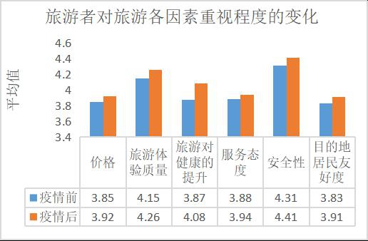 从图4.1可以看出,旅游者对安全的重视程度始终踞居首位,并在疫情影响的情况下有了2.3%的提升,经历本次疫情,消费者对旅游对身心健康的提升作用的重视程度提高了5.4%,是升幅最大的因素。由此,见证了疫情对生命安全的极大威胁后,消费者更注重旅行中的安全和健康因素,所以未来能保证安全的旅游产品和康养旅游产品会更受旅游者青睐。