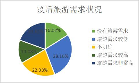 由于疫情在全球的走势依然严峻,不少消费者的旅游信心遭受打击,由问卷结果得知,疫后没有旅游需求、旅游需求较低、旅游需求不明确的答者占总人数的66.51%,仅有19.42%的人有很强的旅游需求,因此,之前关于疫后旅游井喷的说法是站不住脚的,实际情况表明,旅游恢复尚且需要循序渐进地进行。旅游需求的低迷,一方面是因为疫情打击使得许多人经济吃紧,而旅游并非生活必需品,甚至可以成为一种精神奢侈品,所以人们会优先选择满足生理、安全方面的需求;另一方面,四月伊始正值国外的疫情疯狂蔓延期,国内也出现了连续不断的境外输入病例,对安全的顾虑使得旅游者畏惧出远门。尽管国外大环境尚不乐观,国内旅游者的信心已经处于逐渐恢复阶段,在做好疫情安全防控的前提下,旅游需求有望升温。