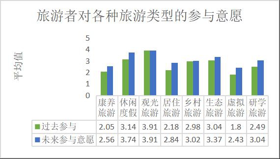 笔者通过设置里克特量表,对消费者对各种旅游类型的过去参与度与未来参与意愿展开了调查,下图结果显示,消费者对康养旅游、研学旅游、生态旅游、居住旅游、虚拟旅游的参与意愿有了大幅上涨,其中虚拟旅游的参与意愿上涨了35%,系需求涨幅最高的旅游类型,但上涨后的总体意愿平均分仅为2.43,是参与意愿最低的旅游类型,因此未来虚拟旅游会有一定的市场,但规模依然会相对小众,旅游者的重心还是身临其境地体验。