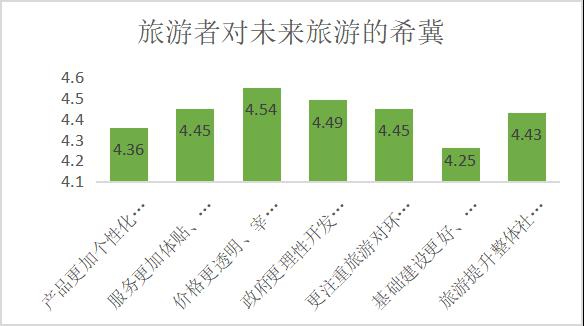 此外,通过旅游达成更好的环境保护、更贴心的服务、更高的社会幸福感也受到了旅游者相当程度的重视,可见旅游对旅游者、对社会的意义已经通往更深远的方向——人类福祉。旅游需要保护环境而不是破坏环境、需要人与人的真诚交流而不是虚情假意的诱骗、需要为社会成员带来更幸福的生活而不是扰乱社会的秩序,这是大势所趋、是心之所向、是未来旅游业奋斗的目标。更多元化的产品和目的地更完备的智慧体系虽相对期望值较低,但仍处于一个很高的基准,因此,未来的旅游业也需要注重产品和基础设施的打造,为消费者提供更满意的旅游体验。