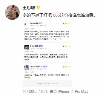 对此,4月22日下午,王思聪微博回应称:“多的不说了好吧666这价格谁点谁血赚。”