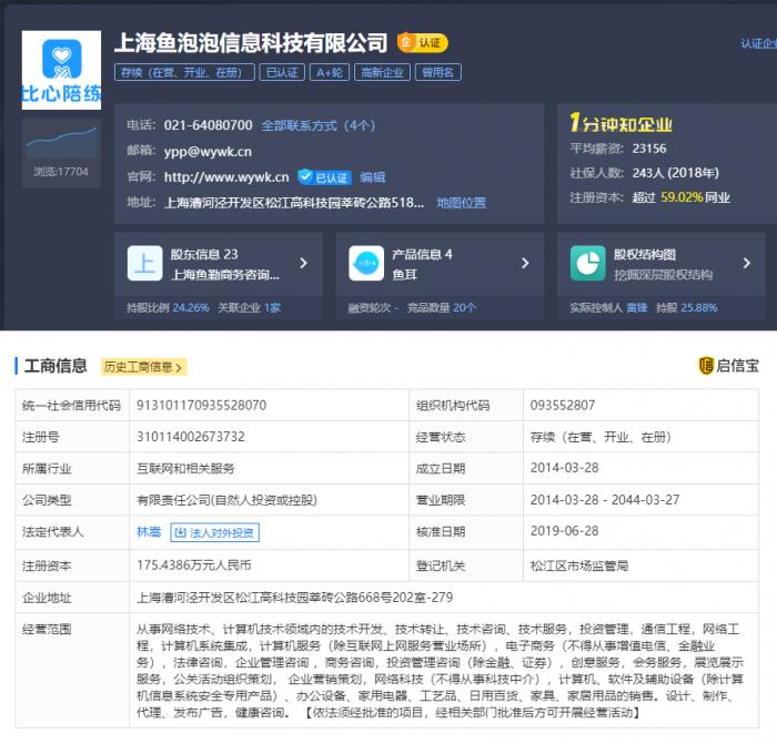 所以,这是变相否认?事实或许并没有这么简单。启信宝数据显示,游戏陪玩平台比心的软件归属权为上海鱼泡泡信息科技有限公司,成立于2014年3月28日,法定代表人为比心创始人林嵩,注册资本175.4386万元。