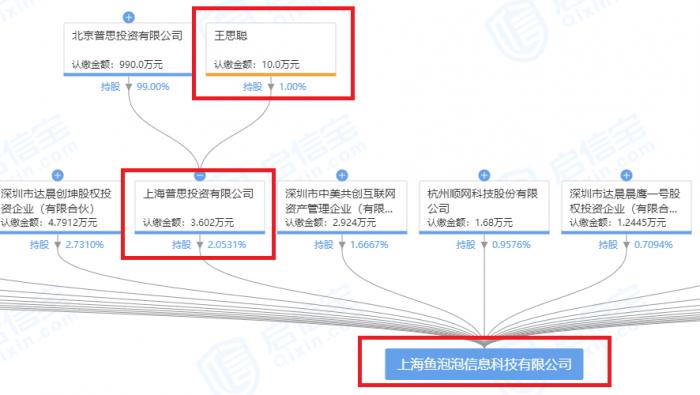 上海鱼泡泡信息科技有限公司有23位股东,其中,王思聪的上海普思投资有限公司也在股东之列,持股2.0531%。