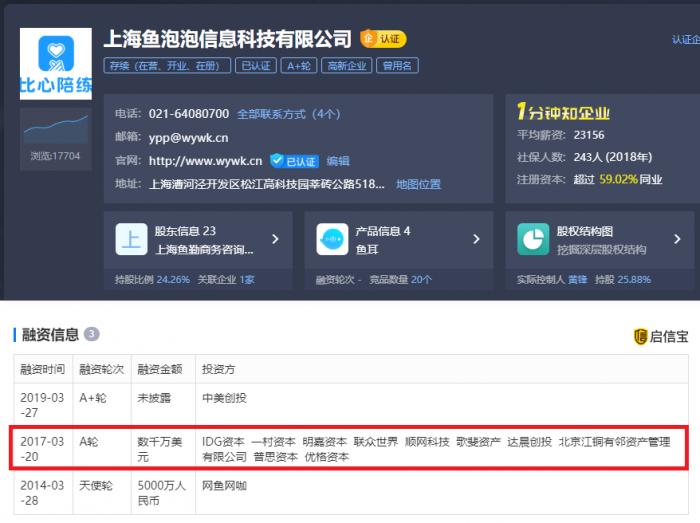 启信宝融资信息显示,上海鱼泡泡信息科技有限公司经历三轮融资,天使轮由网鱼网咖投资5000万人民币,普思资本、IDG资本、联众世界、顺网科技、歌斐资产等共同参与其A轮融资,2019年3月,其获得中美创投的A+轮融资。
