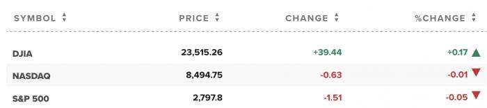 美国东部时间4月23日,受瑞德西韦首次随机临床试验失败的消息影响,美股经历“狂野”一夜。开盘后,道指一度涨超300点,但随后受吉利德科学股价大跌拖累,美股回吐大多数涨幅。截至收盘,道琼斯工业平均指数涨0.17%,报23515.26点;纳斯达克综合指数跌0.01%,报8494.75点;标普500指数跌0.05%,报2797.80点。
