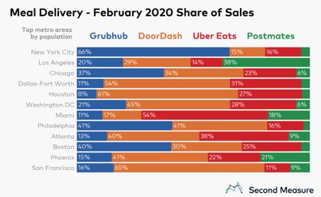 (截至2月美国各大城市群送餐App比例,数据来源:Second Measure)