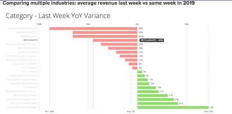 客户管理软件公司Womply则跟踪了全美48000家餐厅的收入,数据显示餐厅收入远低于去年同期的数字,减少比例高达45%。