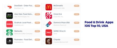 (2019年美国下载量前十的餐饮App,其中有麦当劳、炸鸡品牌、披萨、墨西哥卷饼品牌,数据来源:AppSamurai)