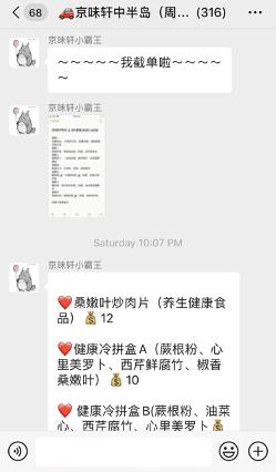 我在这个微信群里看到,一到60单群主就宣布截单。因为再多也“送不过来”,三个员工在每周固定送货的当日中午做好,然后全部跑外送,至于老板则在不断开发健康的新菜。