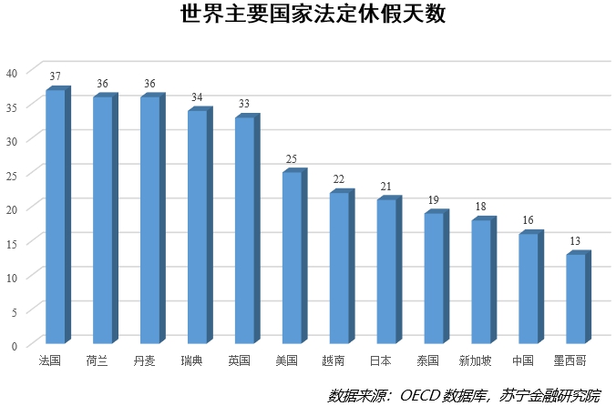 然而放眼全球,中国人在职场上的“拼”可以说是出了名的,因为剔除周末的双休,国人每年的法定休假天数为16天,且不说荷兰、丹麦、瑞典等高福利国家与法国、英国、美国等发达国家,单说在亚洲地区,我国的法定假日也明显低于日本、越南等国家(见下图)。另外,从工作总时长上看,2018年中国人均全年工作时长达2100个小时,仅次于墨西哥的2225个小时,远高于其他国家的工作时长。