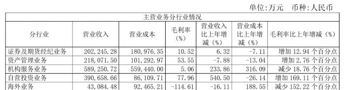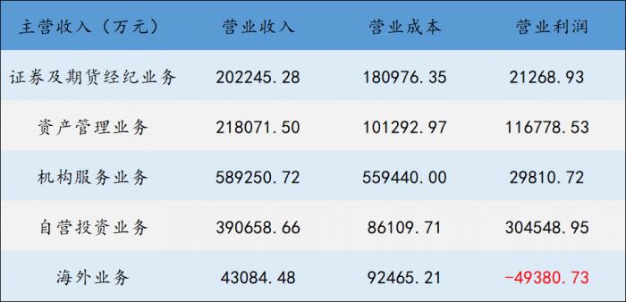 主营业务而言,2019年,公司证券及期货经纪业务实现营业利润2.13亿元、资产管理业务盈利11.68亿元、机构服务业务盈利2.98亿元、自营投资业务盈利30.45亿元、海外业务亏损4.94亿元。海外业务为唯一亏损的主营业务。