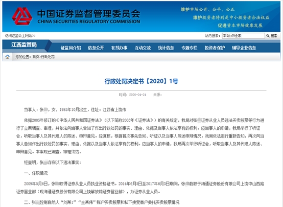 4月24日,江西证监局披露了一份行政处罚决定书,时任海通证券营业部员工的张某,因借他人名义持有、买卖股票以及私下接受客户委托买卖证券,合计被罚没207万元。