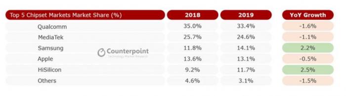 首先看一下手机处理器市场做个参考,根据Counterpoint报告,2019年智能手机应用处理器芯片出货量排行榜中,前五名分别是高通(33.4%)、联发科(24.6%)、三星(14.1%)、苹果(13.1%)和华为海思(11.7%)。谷歌要在这五家企业中争夺份额,难度可想而知。