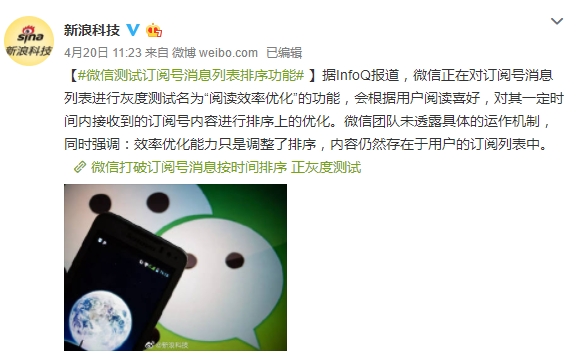 据新浪科技消息,据InfoQ报道,微信正在对订阅号消息列表进行灰度测试名为“阅读效率优化”的功能,会根据用户阅读喜好,对其一定时间内接收到的订阅号内容进行排序上的优化。