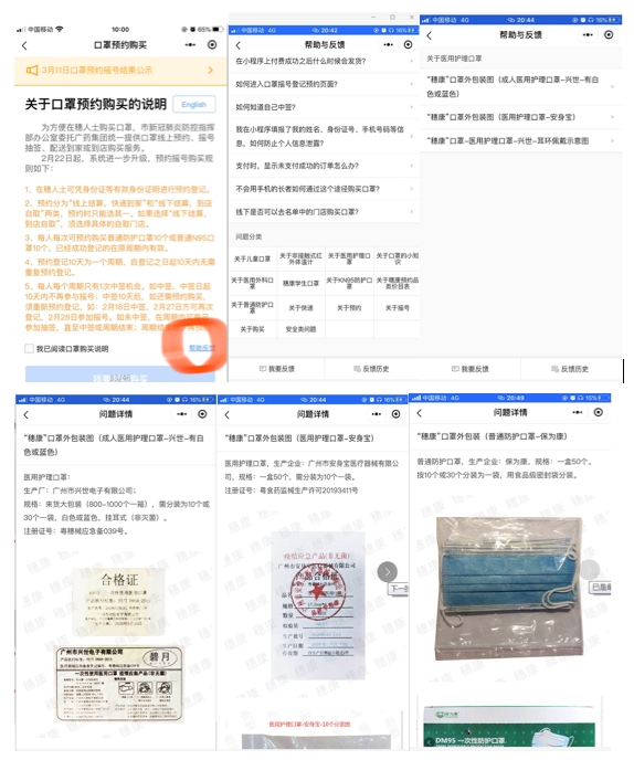 为了方便市民查询、了解“穗康”口罩的产品和质量信息, “穗康”微信小程序“口罩预约购买”板块的“帮助反馈”中,就以详细的图文展示了“穗康”在售口罩的厂家信息、口罩生产的标准、口罩原包装、产品合格证、分装后的实物图等。市民可以进入该页面了解口罩的上述产品信息。