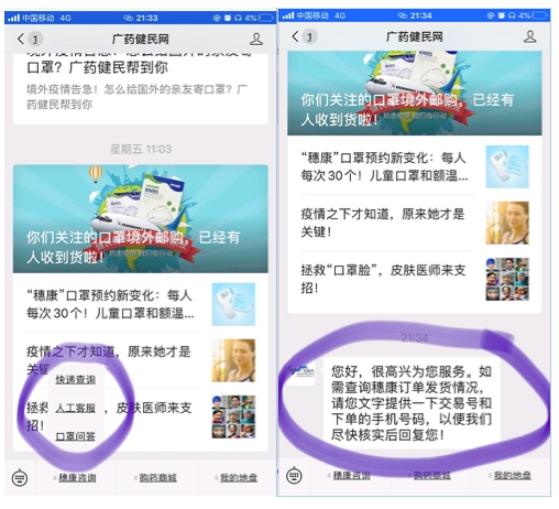 三是“广药健民网”微信公众号设立了人工客服专门处理“穗康”口罩相关问题,市民可以进入该微信公众号菜单中的“穗康咨询”,点击“人工客服”进行沟通,还可以在公众号中查询“穗康”口罩的物流快递信息,追踪快递动向。