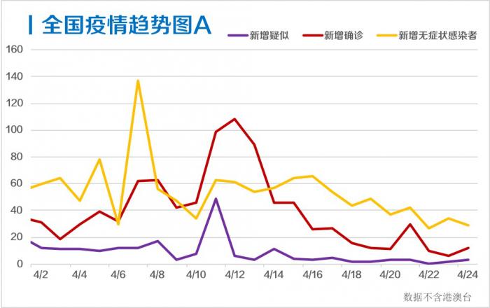 据国家卫健委关于新型冠状病毒肺炎通报的最新数据,4月24日,31个省(自治区、直辖市)和新疆生产建设兵团新增确诊病例12例(累计82816例),其中新增报告境外输入确诊病例11例。新增无症状感染者29例,其中境外输入无症状感染者4例。现有确诊病例838例,新增疑似病例3例(现有17例),重症病例减少8例(现有49例),新增治愈出院病例89例(累计77346例),无新增死亡病例(累计4632例)。截至4月24日24时,累计报告境外输入确诊病例1629例。