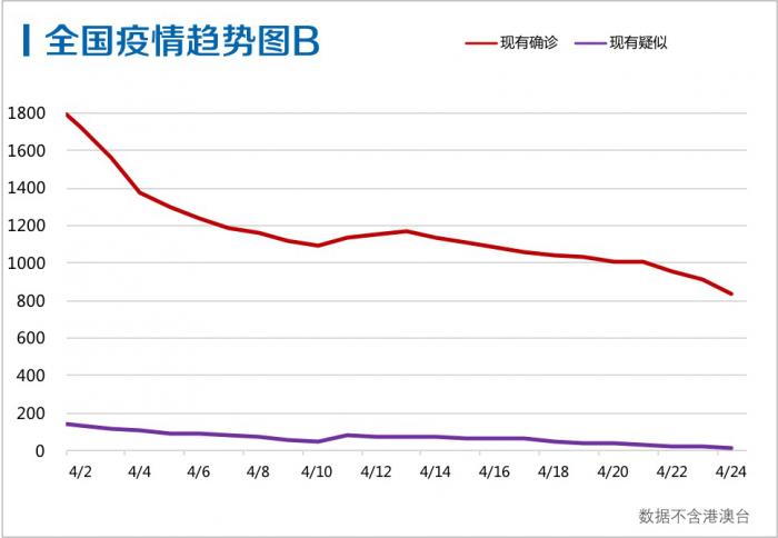 截至4月24日24时,全国现有疑似病例17例,新增疑似病例3例,其中2例为境外输入疑似病例,1例为本土疑似病例(北京1例)。其中湖北现有疑似病例保持为零,已连续40天零新增。