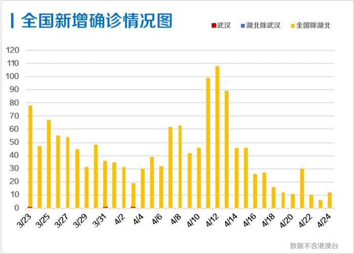国家卫健委消息,4月24日,全国(不含港澳台,下同)新增确诊病例12例,其中11例为境外输入病例,1例为本土病例(黑龙江1例)。全国重症病例人数降至50例以下,为49例,值得注意的是,武汉重症病例实现了清零。
