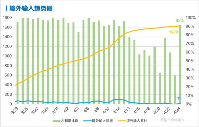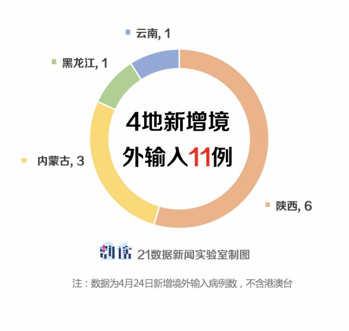 另一方面,4月24日,全国新增11例境外输入病例,陕西6例,内蒙古3例,黑龙江1例,云南1例,境外输入病例占新增病例比例的92%。累计报告境外输入1629例。