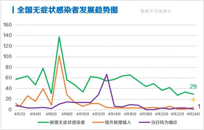4月24日,全国新增无症状感染者29例,其中境外输入无症状感染者4例;当日转为确诊病例1例(境外输入1例);当日解除医学观察24例(境外输入10例);尚在医学观察无症状感染者983例(境外输入150例)。