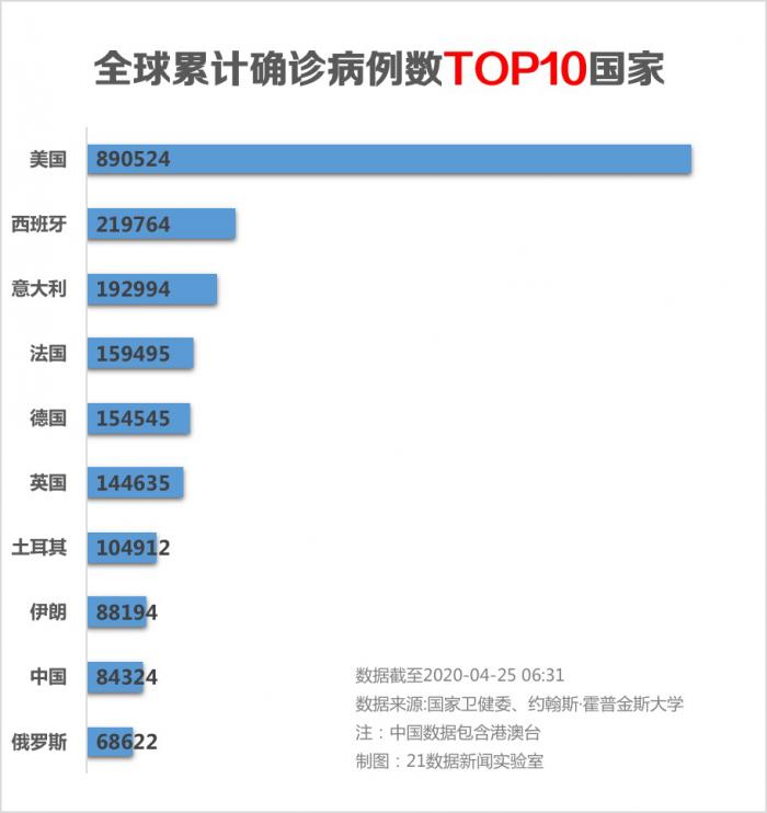 海外网报道,据美国约翰斯·霍普金斯大学发布的实时统计数据显示,截至北京时间4月25日6时30分左右,全球累计确诊新冠肺炎病例2790986例,累计死亡195920例。