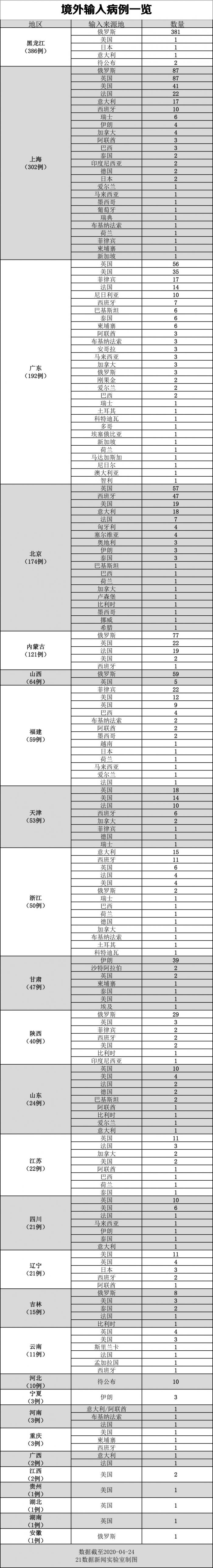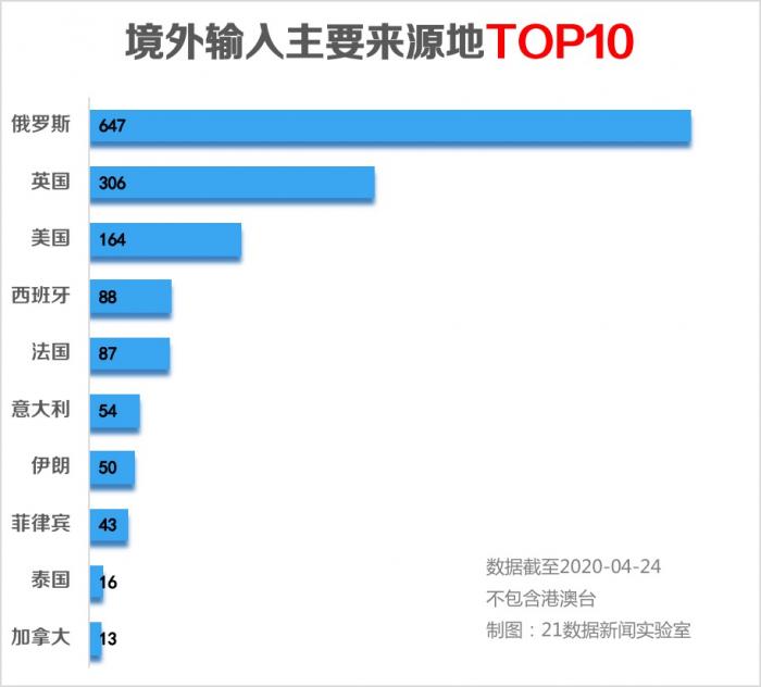 俄罗斯、英国、美国是境外输入 主要来源地。截至4月24日24时,俄罗斯已累计输入病例647例,英国输入306例,美国输入164例。(详情查看文末附表:境外输入病例一览)